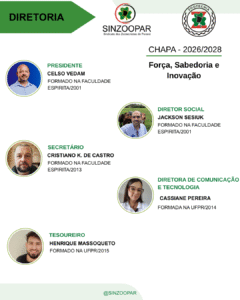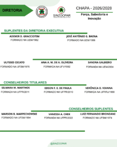 No dia 24 de novembro de 2025 ocorreu nossa eleição para a nova diretoria do sindicato. A única chapa a se candidatar e portanto eleita, foi a chapa “Força, Sabedoria e Inovação”, e irá representar o Sinzoopar nos próximos 3 anos.