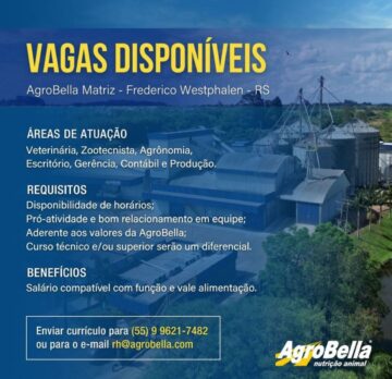 VagaÁREAS DE ATUAÇÃO: – Gestão de processos; – Manejo de bovinos; – Qualidade do leite; PRÉ-REQUISITOS: – Disponibilidade para viagens; – Disponibilidade para mudar de estado ETAPAS: – Envio do currículo: até 30/04 – Entrevista: Maio 2024 CONTATO: estagio.vacasehomens@gmail.com
